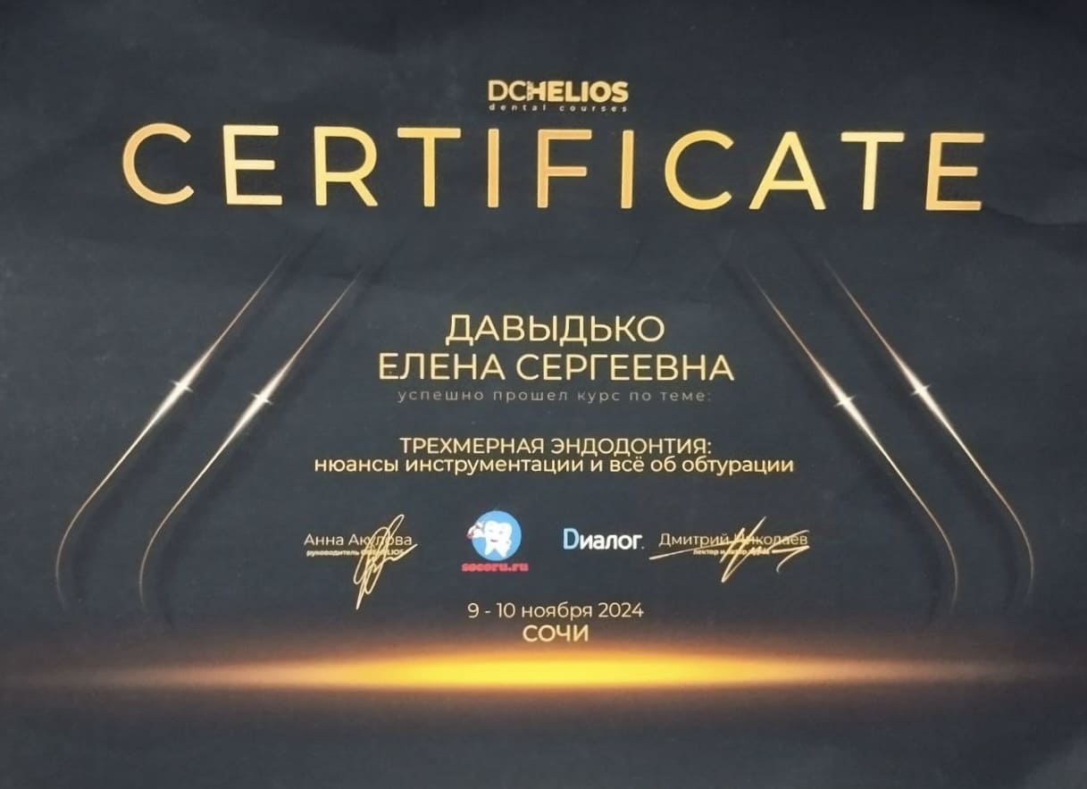 9–10 ноября 2024 г. «Трехмерная эндодонтия: нюансы инструментации и всё об обтурации». Сочи. Сертификат