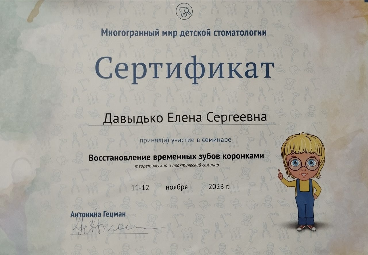 11-12 ноября 2023 г. «Восстановление временных зубов коронками». Сертификат