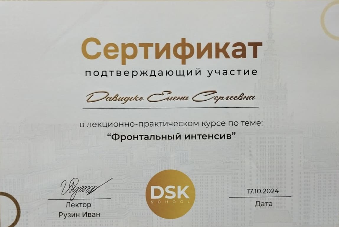 17.10.2024 Участие в лекционно-практическом курсе по теме: «Фронтальный интенсив». Сертификат