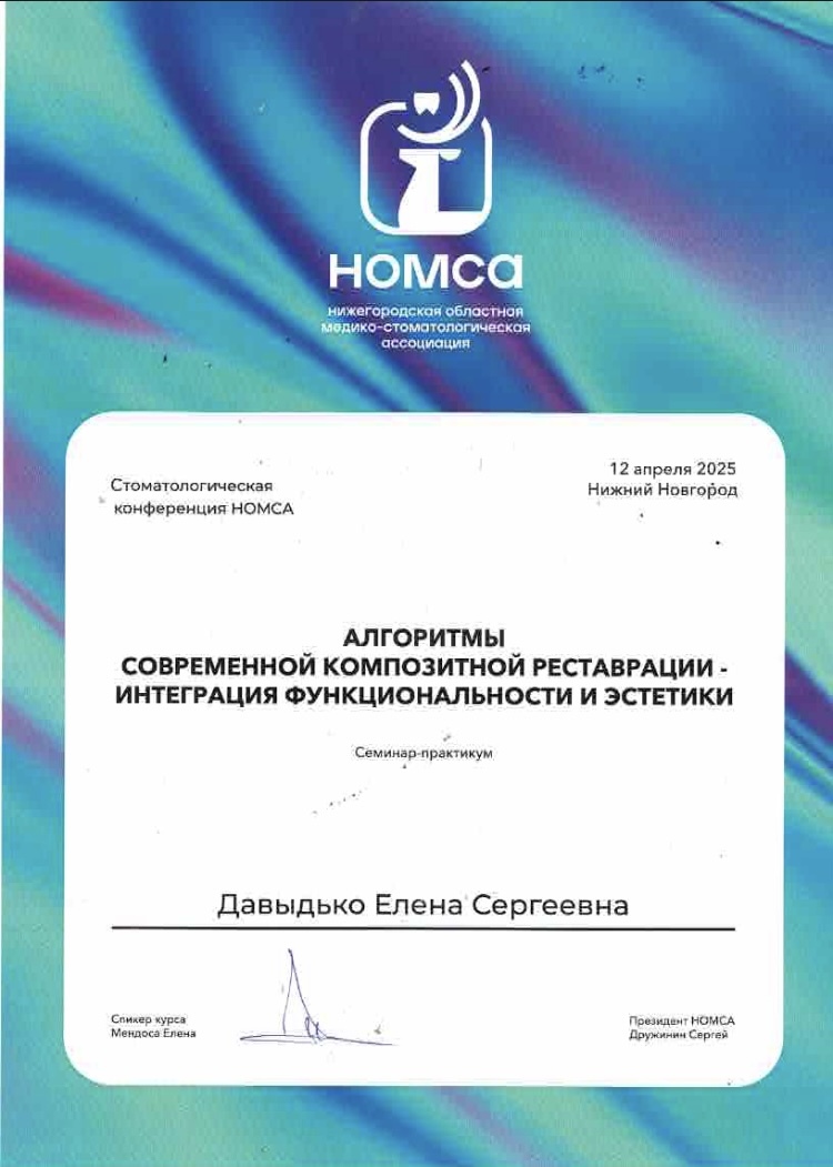 12 апреля 2025 г «Алгоритмы современной композитной реставрации — интеграция функциональности и эстетики». Сертификат