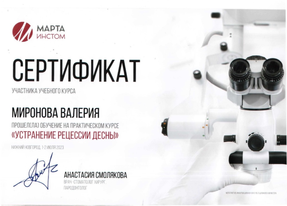 01.07.2023−02.07.2023 Прошла обучение на практическом курсе «Устранение рецессии десны» Сертификат