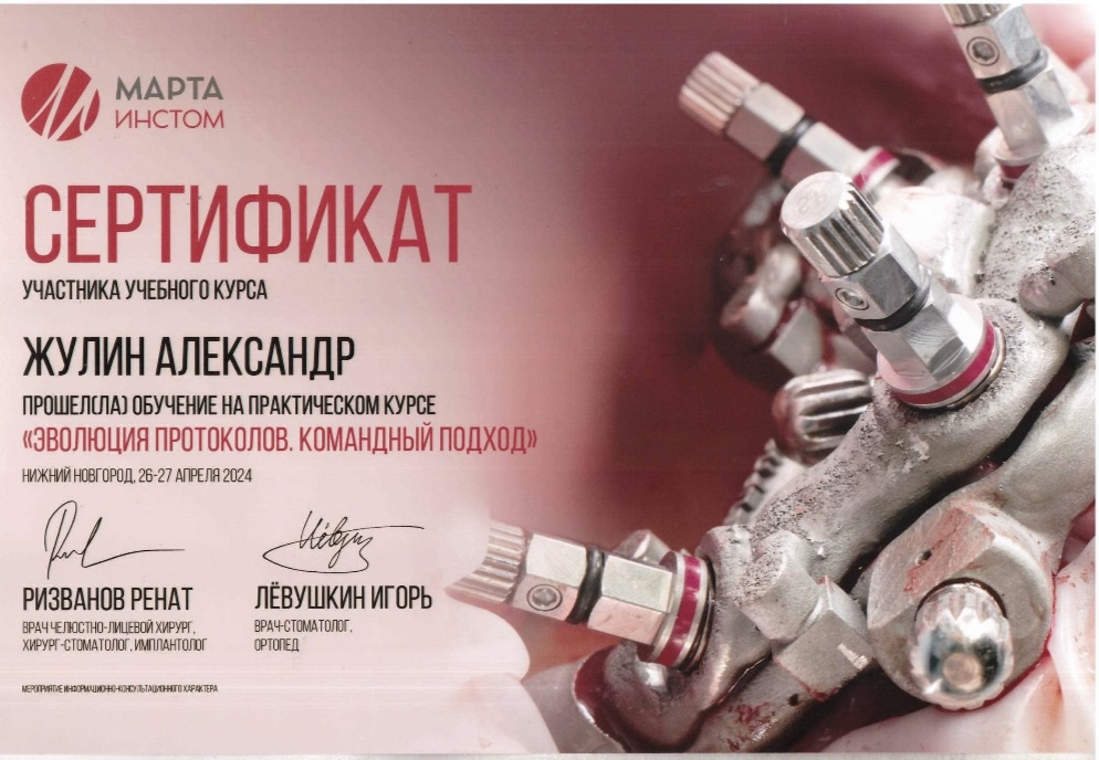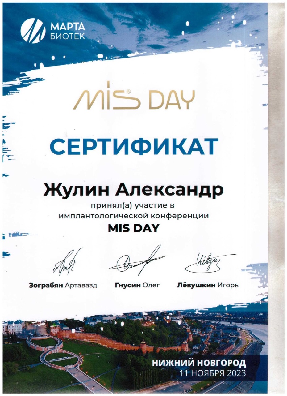 11 ноября 2023 г. Принял участие в имплантологической конференции. Сертификат