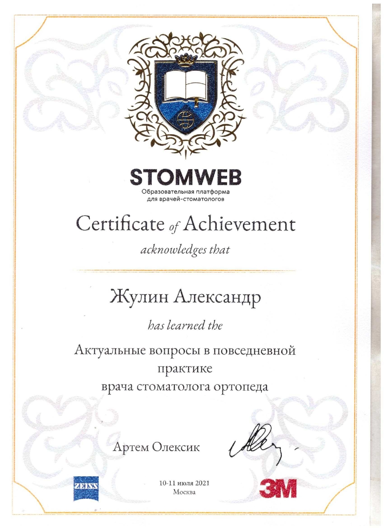 10-11 июля 2021 г. Сертификат - "Актуальные вопросы в повседневной практике врача стоматолога ортопеда". Сертификат
