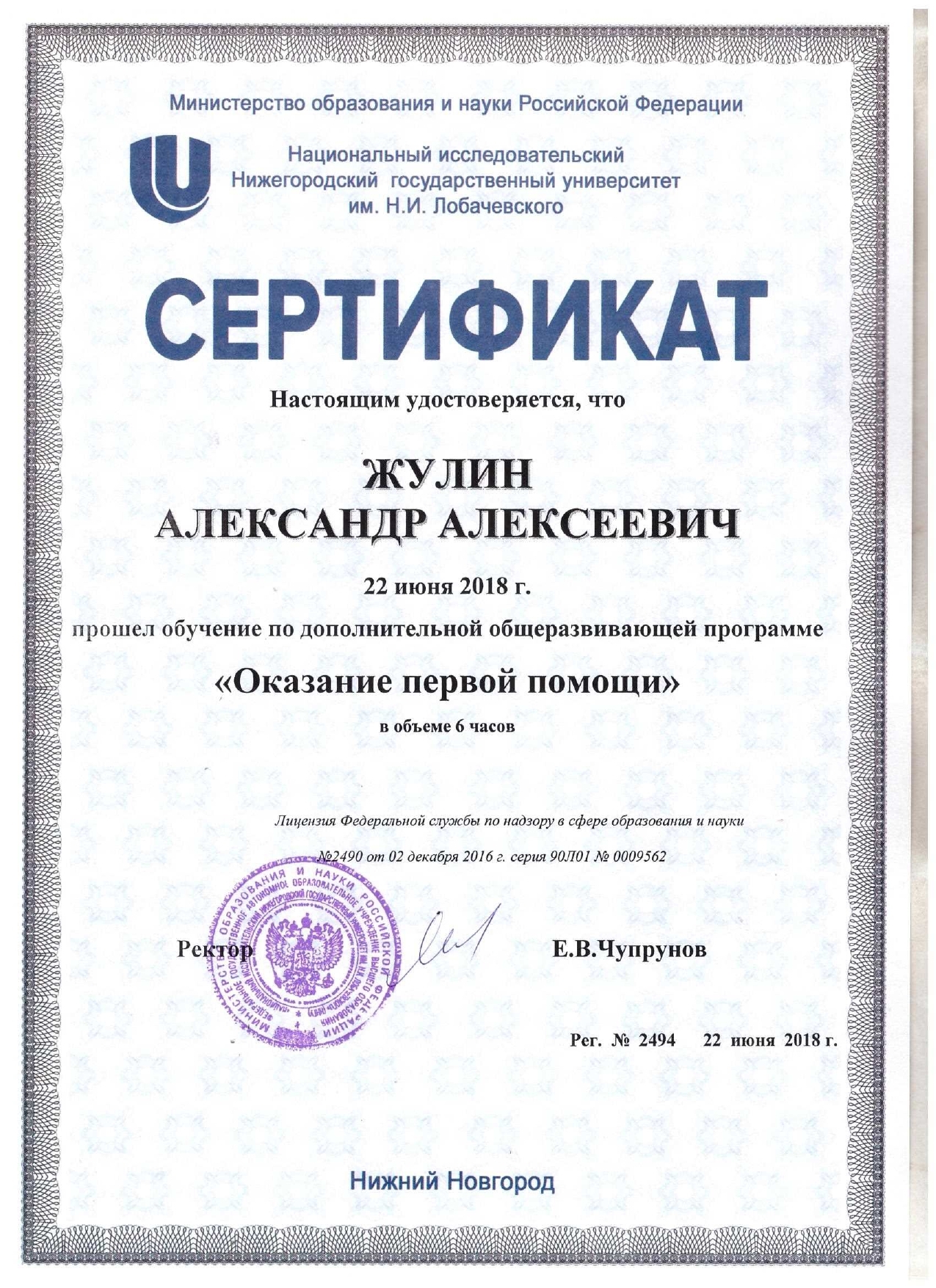 22 июня 2018 г. Прошел обучение по дополнительной общеразвивающей программе - "Оказание первой помощи". Сертификат