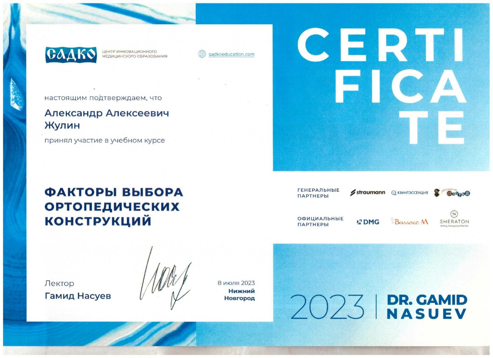 8 июля 2023 г. Принял участие в учебном курсе - "Факторы выбора ортопедических конструкций". Сертификат