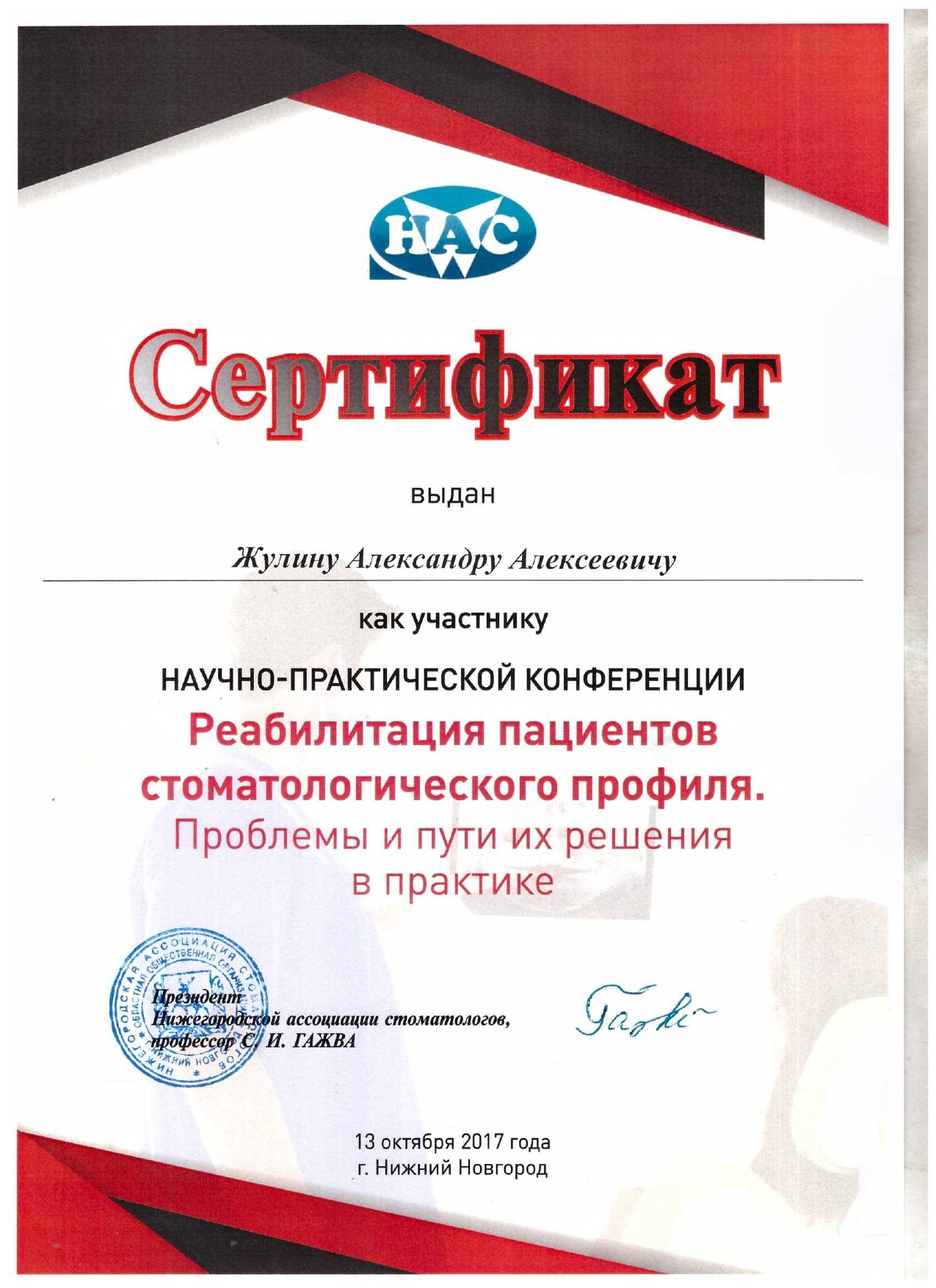 13 октября 2017 г. Сертификат участника научно-практической конференции — «Реабилитация пациентов стоматологического профиля. Проблемы и пути их решения